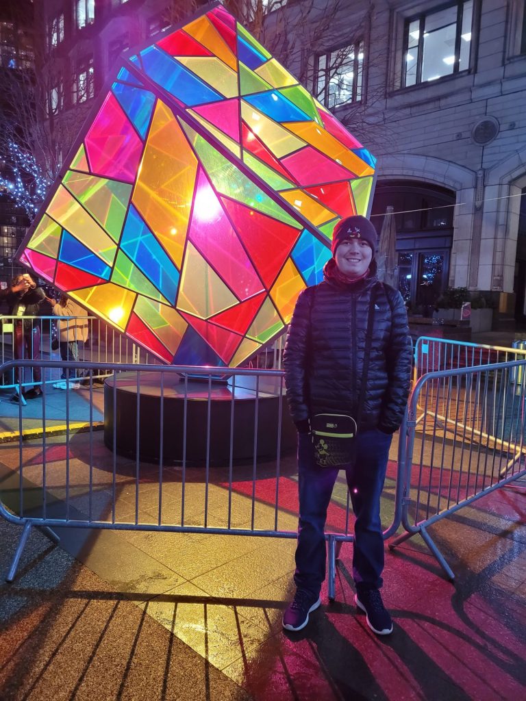 Friday 18th December 2020 I went to see the Winter Light Festival at Canary Wharf with My Auntie Denise, we travelled there on the District and DLR Lines. There were 15 different winter lights to look at and we manage to see most of them. It took about an hour to walk around and see all the different works of art. The winter festival was very impressive and I really like all of the different lights and my favourite was the coloured cubed one because it reminded me of the Nintendo Gamecube. Tonight I had a Nandos takeaway at my Nanny Pat’s House I had a chicken burger with cheese, halloumi and Pineapple! It was amazing as I really like pineapple. Chips and garlic bread Merry Christmas and Happy New Year to Everyone this is my last blog until January. Below are some pictures from my day and also if you like reading my blog please comment.