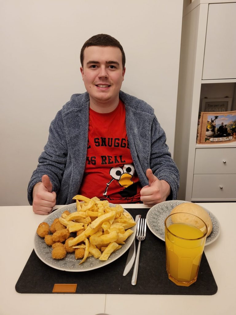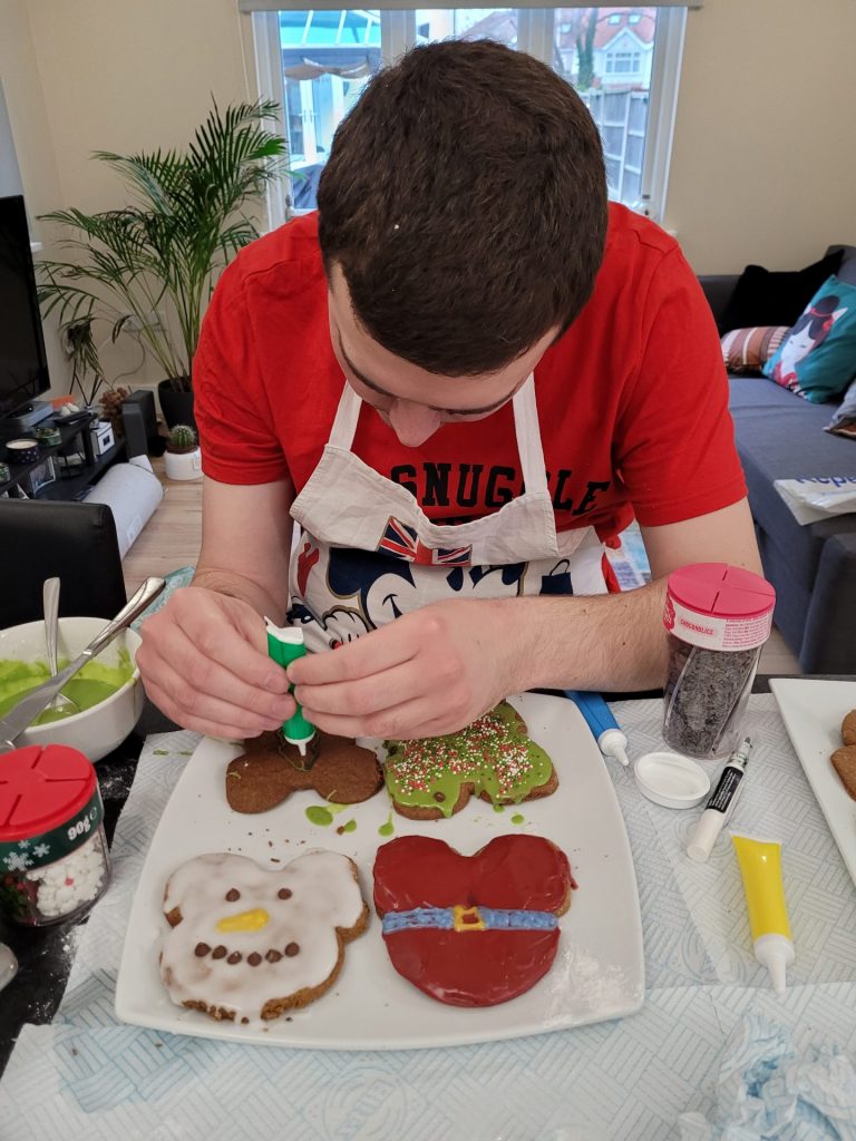 Friday 27th November 2020 I made Mickey Mouse Christmas biscuits and Mince Pies with my Auntie Denise. First I added soft butter and sugar together then I added flour. I rolled the pastry out with my rolling pin and made my Mickey Mouse shaped biscuits and I put them in the oven for 15 mins. I then decorated them with icing and festive toppings. I used a glass to make my mince pie shapes then added mince and cooked them for 20 mins. I really enjoyed making the biscuits and mince pies and they were very yummy. Tonight I had a takeaway from my local Fish and Chip shop and I had Scampi and Chips. Below are some pictures from my day and also if you like reading my blog please comment.