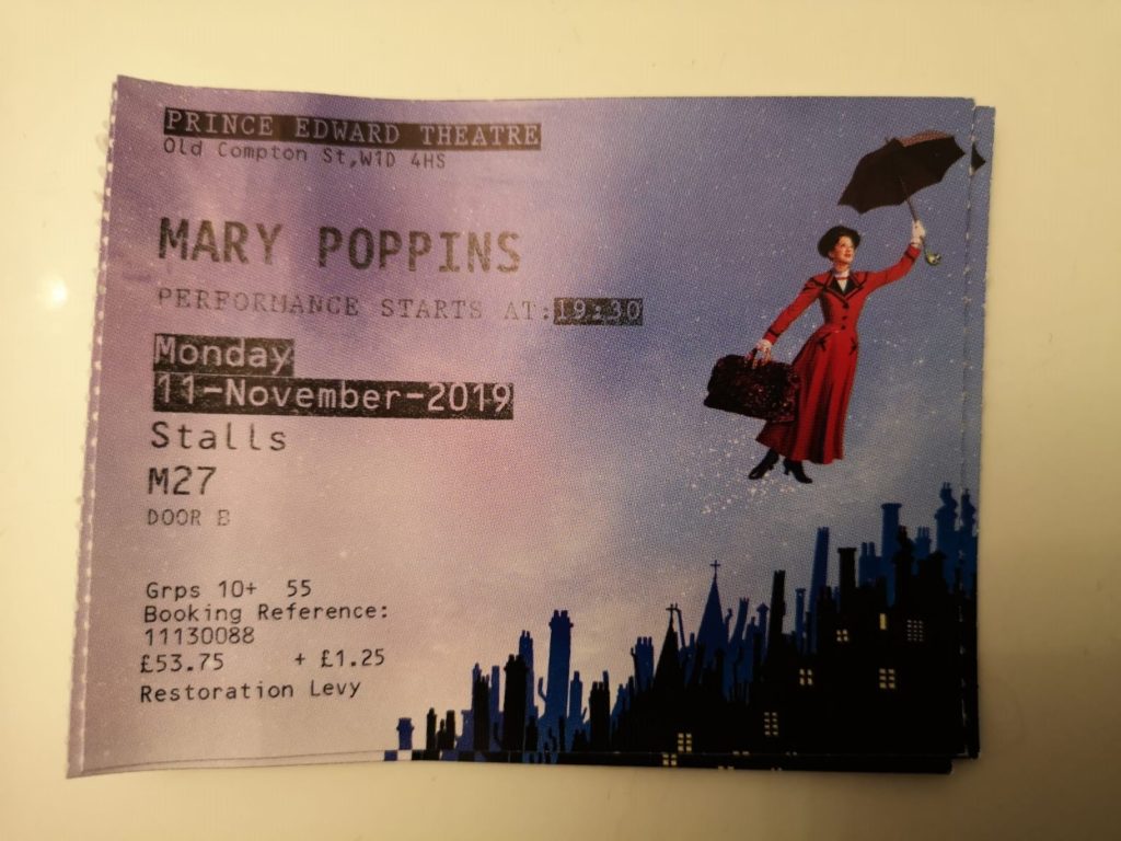 For this week’s blog I am going to write about something I did recently that I really enjoyed. On Monday 11th November I went to the Prince Edward Theatre in Old Compton Street to see Mary Poppins. I like going to the theatre and I also like the film’s about Mary Poppins so I was really looking forward to the show. I went to the show with my dad and sister and we went to Shake Shack beforehand to get something to eat. The show was excellent the performers were all great especially the actress who played Mary Poppins. The stage, the costumes and dance routines were also very impressive. My favourite songs were Step in Time and supercalifragilisticexpialidocious which were both great and a lot of fun. I would recommend the show to anybody who likes the film as it was very well done. We all had a great night and enjoyed our night in the West End.
